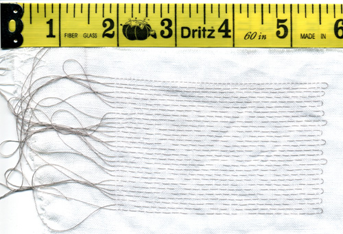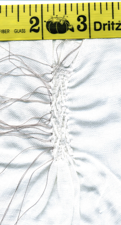 Notice that the gathered area is slightly less than 4 inches originally but has gathered down to approximately 3/8 inch. This is an even greater gathering reduction than the 6:1 or 8:1 that I was getting with the medium-weight linen. It's also significantly more than my estimate of the gathering reduction in the S. Thomas Becket alb, although it looks like it might be roughly equivalent to that of the S. Hugh alb.