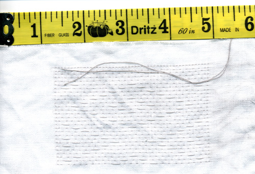 The class I taught at Darkwood A&S on 7/8/06 used a relatively heavy-medium weight linen that came with a small gingham check pattern which we used as a guide to learning the technique. Here's my first experiment with a relatively fine plain-color linen. The fabric is about 50 threads per inch. I worked the gathering stitches on an imaginary grid of 4x4 threads, picking up 2 threads for the ground stitches and going behind 10 (2+8) for the pattern stitches. Because I'm nearsighted (and slightly crazy) I went ahead and worked this by counting threads rather than marking the pattern. Here's the finished pattern (before gathering) from the right side: