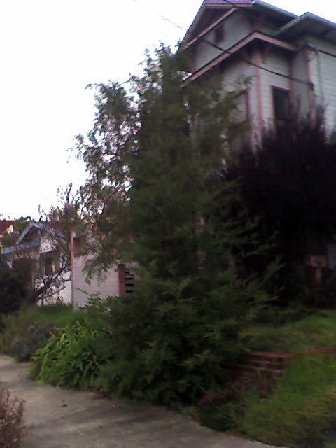 My neighbors have a redwood tree in their backyard. It's about 4 stories tall and makes me glad that there are other houses in the way for it to fall on before hitting mine. Every once in a while, their tree gets amorous and I find redwood seedlings in odd places in my yard. Usually I just pull them out as the weeds they are, but there's one in the little strip next to the sidewalk that I've let grow.