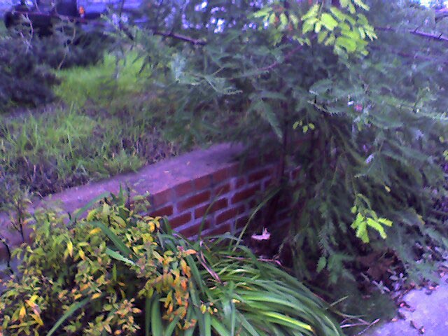For those not familiar with redwoods, one of the things they do is to continue springing up tenaciously from any roots or stumps left behind. This is why you sometimes get "rings" of redwoods (sort of like a ring of standing stones): a large old tree died for some reason, but a bunch of suckers came up from the edges of the old root system, circling around the space where the original tree stood. So after I cut my Christmas tree there's always something to keep growing. (That lighter blotch down near the bottom of the bricks is the cut stump.)