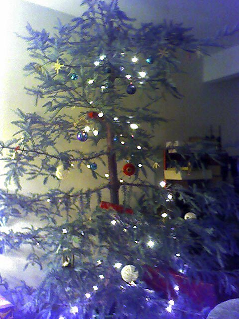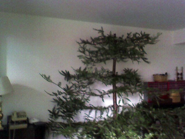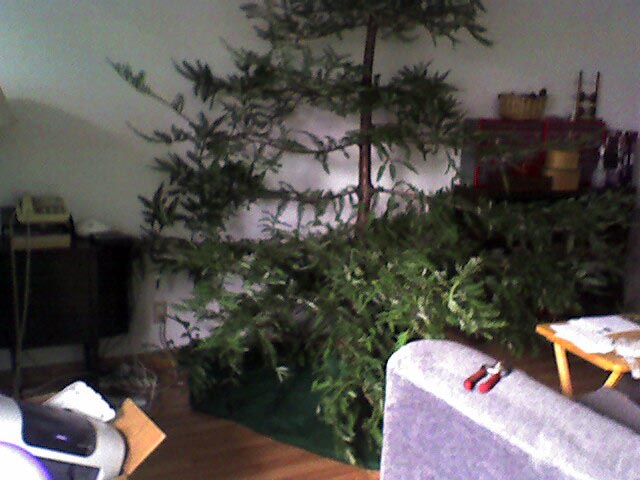 I kept meaning to shape the tree a bit over the years, but of course I never got around to it, so we've got a fairly scraggly thing, taking up way too much space. (But note the pruning shears in the foreground, sitting on the back of the couch.)