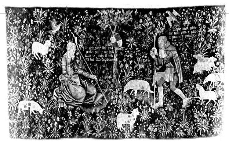 This is a fragment of a tapestry now located at the Musée des Gobelins, Paris.